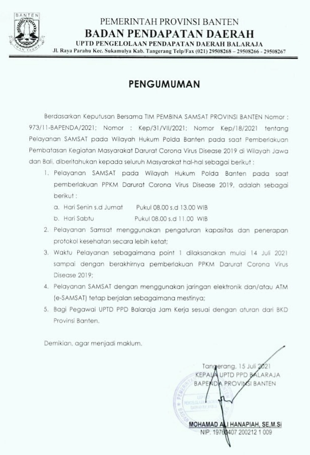 Moh. Ali Hanapiah selaku Kepala UPTD PPD Balaraja Bapenda Provinsi Banten menyampaikan melalui rekaman resmi dalam perubahan jadwal pelayanan di kantor Samsat dalam penerapan saat masa Pemberlakuan Pembatasan Kegiatan Masyarakat (PPKM) darurat.