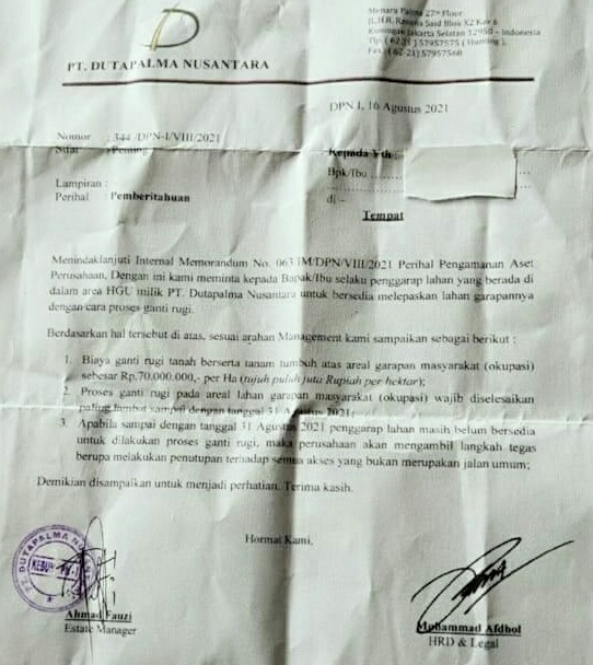 "Agar pasti, adanya himbauan yang di keluarkan Perusahaan PT.Duta Palma Nusantara (DPN) dapat di artikan sebagai sebuah ancaman terhadap masyarakat adat Benai. Disitu di beri deadline sampai tanggal 31 Agustus 2021. Arti nya pihak perusahaan merasa berkuasa terhadap lahan yang di klaim nya itu berada dalam HGU," terang Tri via WhatsApp.