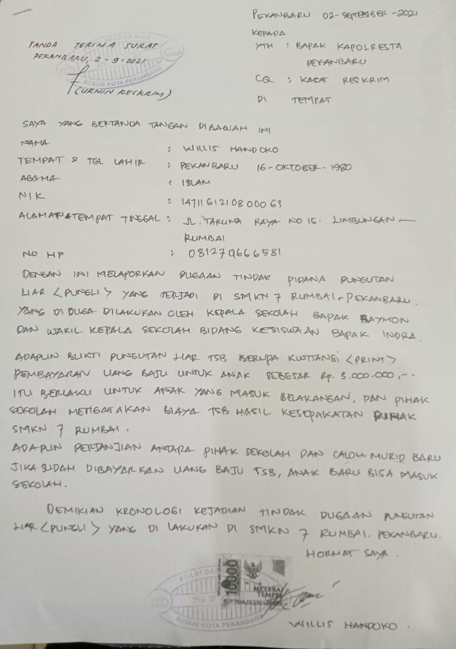 Sehingga membuat seorang aktivis dunia Pendidikan di Riau, Wilis Handoko angkat bicara dan melaporkan dugaan pungutan liar yang terjadi di lingkungan SMK 7 Pekanbaru.