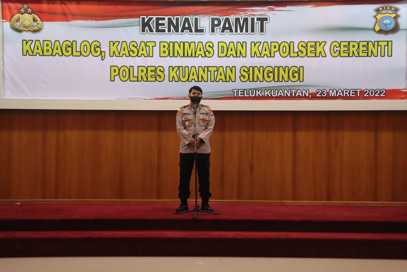Kepada pejabat lama yang akan melaksanakan tugas ditempat tugas yang baru diucapkan terima kasih atas kinerjanya selama di pokres kuansing dan semoga sukses ditempat tugas baru, dan kepada pejabat yang baru agar dengan segera dapat menyesuaikan dirinya terhadap tugas tugas yang ada dan lingkungan tugasnya, terutama di lingkungan masyarakat yang saat ini masih dalam masa pandemi virus covid 19.