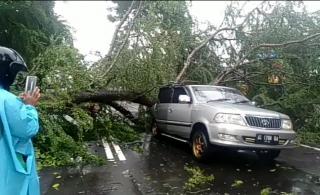 Hujan Lebat di Sertai Angin Kencang Membuat Pohon Tumbang dan Menimpa Sebuah Mobil di Kota Tulung Agung